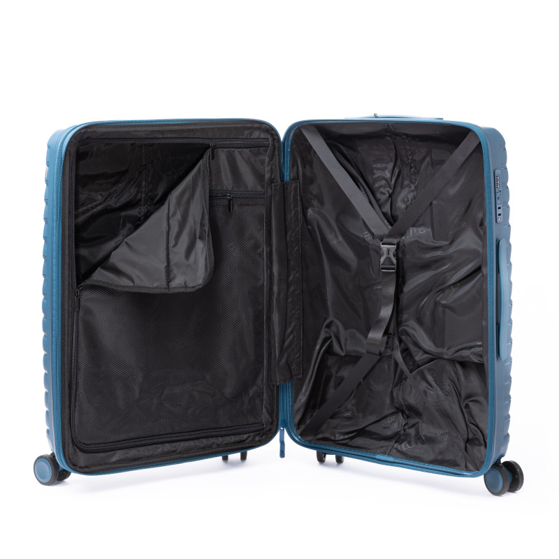 Lagaminas pagamintas iš polipropileno - tvirtos, smūgiams atsparios medžiagos, kuri padeda apsaugoti jūsų daiktus transportavimo metu. Erdvi vidinė erdvė leidžia patogiai susidėti drabužius ir kitus reikalingus daiktus, o vidiniai diržai padeda palaikyti tvarką.
